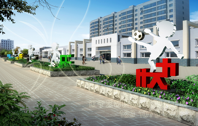 我們將“快樂足球夢”五個字的比劃拆開,做成了五個現(xiàn)代的雕塑,同踢足球小孩的剪影雕塑相結(jié)合,充滿激情運動的足球風(fēng)情。