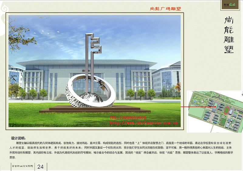 校園雕塑是校園文化中的重要組成部分,能夠裝飾、豐富和美化校園環(huán)境空間,豐富師生的精神生活,同時(shí)也是一個(gè)時(shí)代文化狀態(tài)的集中體現(xiàn)。雕塑的價(jià)值在于審美,一件雕塑作品的價(jià)值取決于是否能給人以美的享受。校園中的許多雕塑,從不同角度反映了校園文化的價(jià)值取向。雕塑是校園物質(zhì)文化的一種表達(dá)方式,同時(shí)也是精神文化的集中反映。設(shè)計(jì)成功的校園雕塑,有很多方面是值得我們?nèi)タ紤]。
