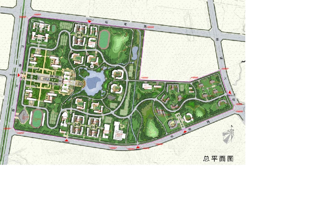 核心型布局也是非常常見的一類大學校園空間結(jié)構(gòu)形式,其主要特征是有一非常明確的內(nèi)聚性很強的校園中心區(qū)域,其他建筑元素圍合它而存在,形成一種內(nèi)向型的大學校園空間。校園的中心區(qū)可以是校園標志性建筑、建筑群、集中綠化、水體和廣場等要素,諸多建筑及環(huán)境要素圍繞校園核心呈放射狀或環(huán)抉布置, 有的學者將中心環(huán)境以綠化為主的核心型空間結(jié)構(gòu)稱為“綠心型”結(jié)構(gòu)。這類校園布局中』合明確、環(huán)境統(tǒng)一、條理性強,容易形成校內(nèi)環(huán)形交通,有利于人車分流和保持校園環(huán)境的安靜,但在使用時應注意采用豐富的手法來打破單一放射狀所容易形成的呆板和過強的紀念性。 美國PCF事務所三巨頭之一亨利·柯布(Heny Cobb)和華東院浦東分院合作設計的上海中歐國際 工商學院采用的是一種內(nèi)聚圍合的空間結(jié)構(gòu)。校園以亞洲資訊信息中心作為整個校 園的核心,教學中心、宿舍、服務性房間分別布置在四周以形成圍合,敞廊將各單體建筑串聯(lián)成富有活力的校園群落。路易·康(Louis I. Kahn)設計的印度經(jīng)濟管理學院,以圖書館為核心,建筑呈45°角斜置的方式布置成串,平面上以圖書館一教室一學生宿舍一教師宿舍成放射狀向外分布。深圳大學建筑學院設計的上海華東大學嘉定校園規(guī)劃也是這種內(nèi)聚的校 園布局中比較成功的作品之一。
