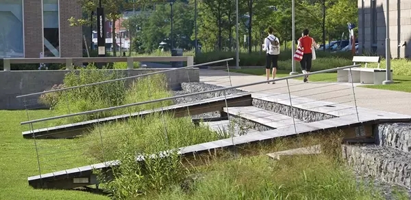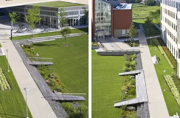 該地塊之前長期作為校園的交通空間,因此周邊景觀設(shè)計都圍繞著機動車展開。起初,景觀設(shè)計師和客戶以及建筑師通力合作,試圖運用不同的方法來對建筑進行布局,以打造出高品質(zhì)的戶外空間。這樣便可以整合原先校園內(nèi)零散的交通空間,并將步行空間與濕地聯(lián)系起來,同時建立更加精確的雨水收集途徑。這一地塊內(nèi)的開放空間十分有限,并且委托方要求設(shè)計一處相對傳統(tǒng)的校園空間。最后建成的Z型宿舍區(qū)域內(nèi)形成了2個新的庭院空間,這兩個空間通過一個2層樓高的連廊相接,從那里可以眺望南部的濕地景觀。場地的規(guī)劃緊緊圍繞著明確的中軸線展開,庭院和濕地由一條開敞的通道相連。規(guī)劃取消了場地中一處利用率率很低的車站,取而代之的是在校園北面創(chuàng)建了一整片“校園綠”空間,該空間同時可作為校園的集會場所以及濕地走廊和餐廳的主入口。場地上原有的因工業(yè)用途而產(chǎn)生的地形變化被保留下來,但是被一面狹長的混凝土座椅墻分隔成相對獨立的空間,矮墻標示了校園主體建筑的入口。南部的“濕地庭院”由斜坡式草坪開放空間和一條180英尺長的生態(tài)草溝組成,生態(tài)草溝一直延伸至沼澤之中,它可以用于收集場地上的雨水。二期工程中,步道將會延伸至沼澤的邊緣處的觀景平臺。